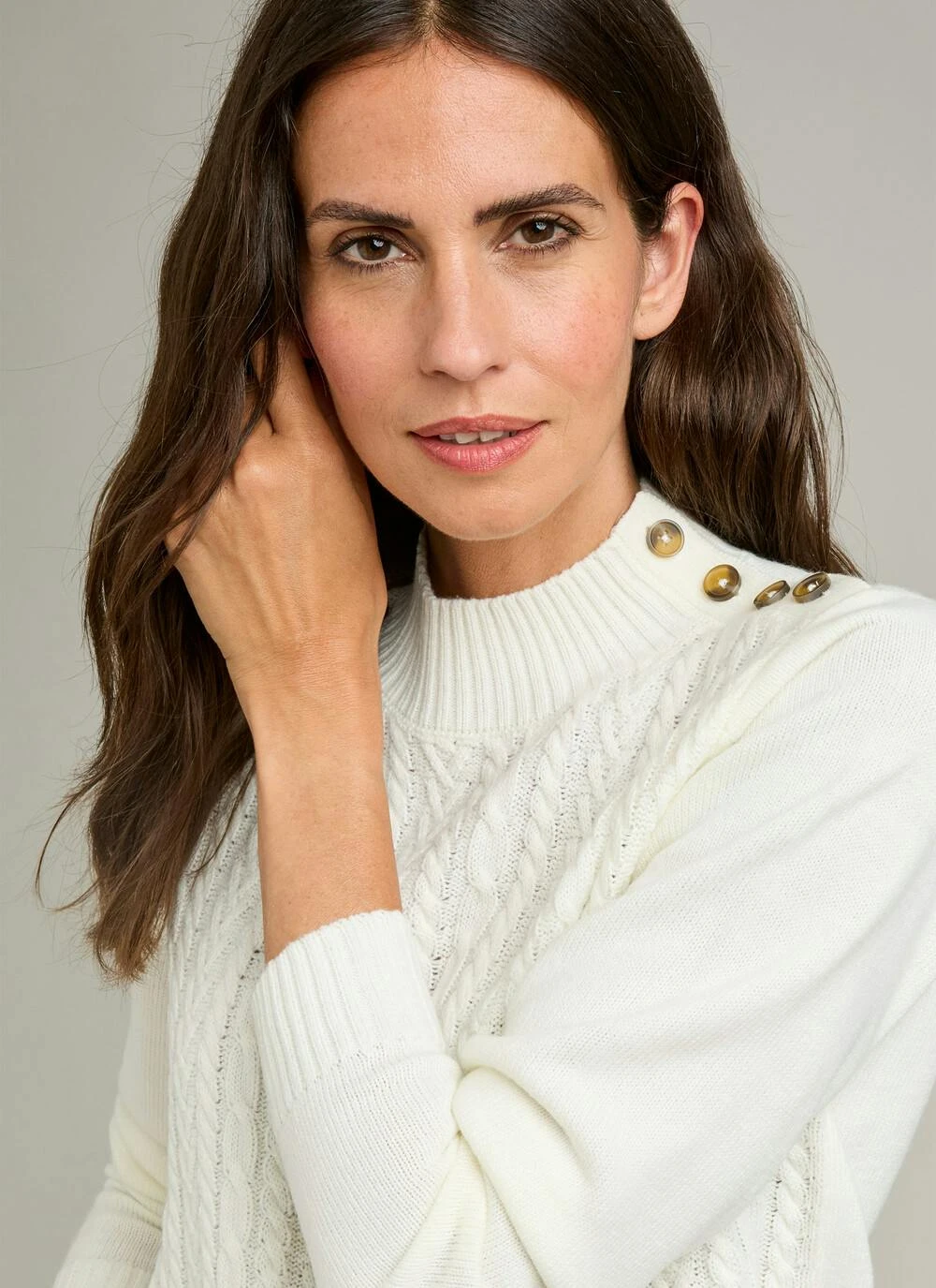 Designed with a flattering turtle neck, this jumper by Isle is the perfect base for any outfit. Designed with a pretty front cable in a regular fit and featuring button detailling on the shoulders. Wear with your favourite jeans or jeggings.