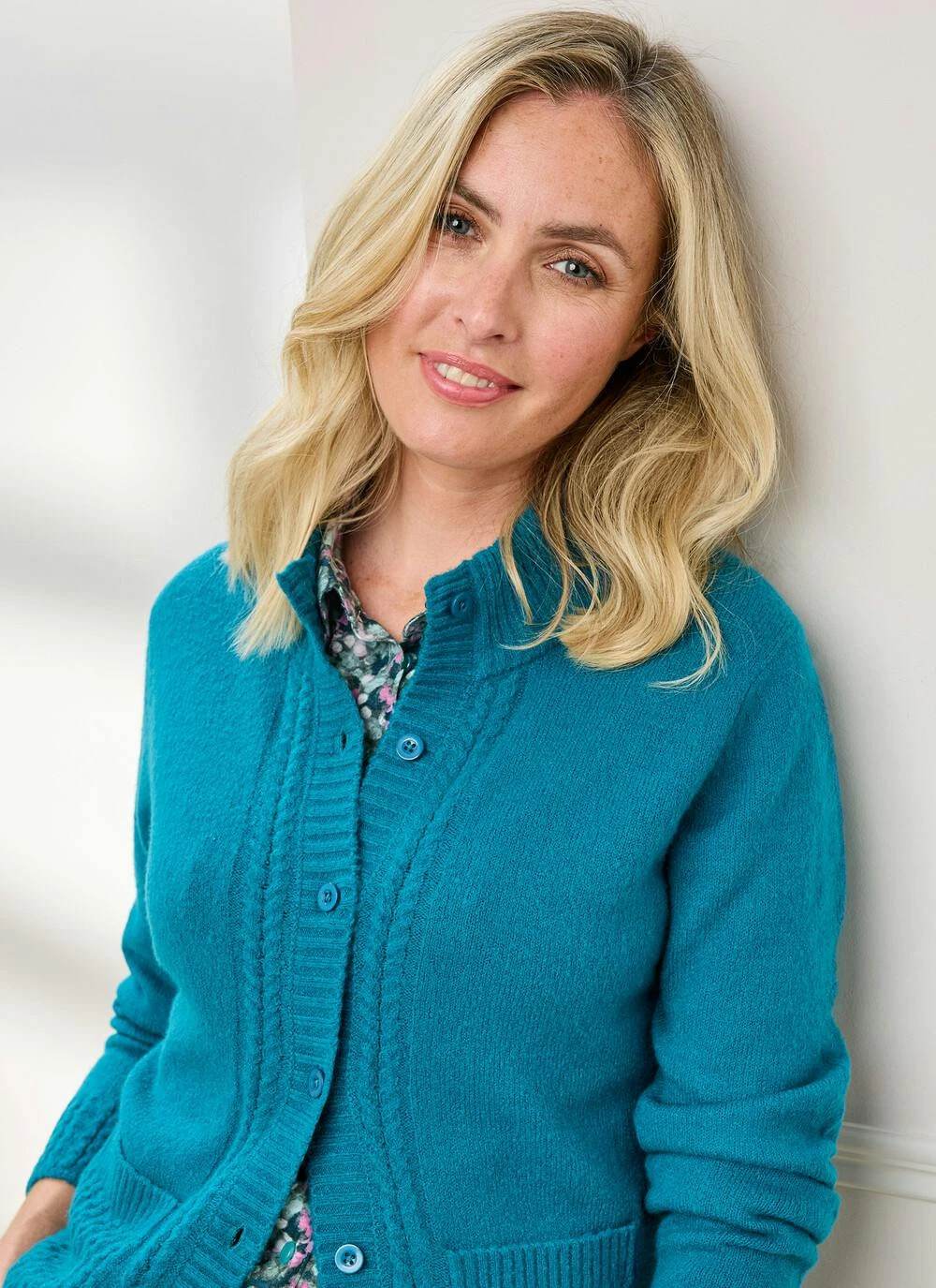 Button up high neck cardigan with long sleeves and two functioning front pockets, featuring feminine cable knit trims. Team with Honor Millburn Collection trousers and skirts for a lovely fresh look for the new season.