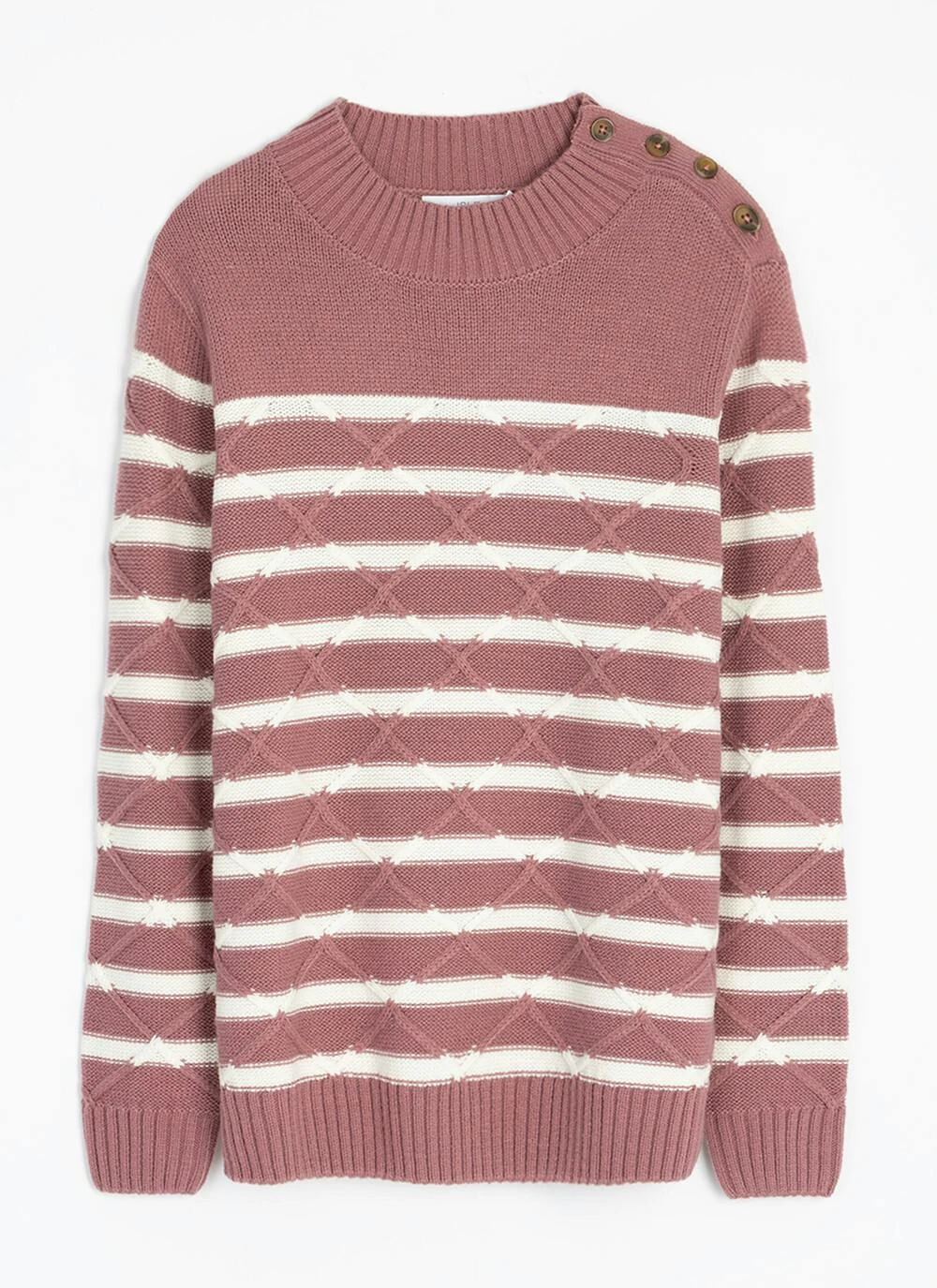 Designed with a flattering turtle neck, this jumper by Isle is the perfect base for any outfit. Featuring button detailling on the shoulders, a lattice cable knit design and a bold striped design, this regular fit jumper looks great worn with jeans or jeggings.