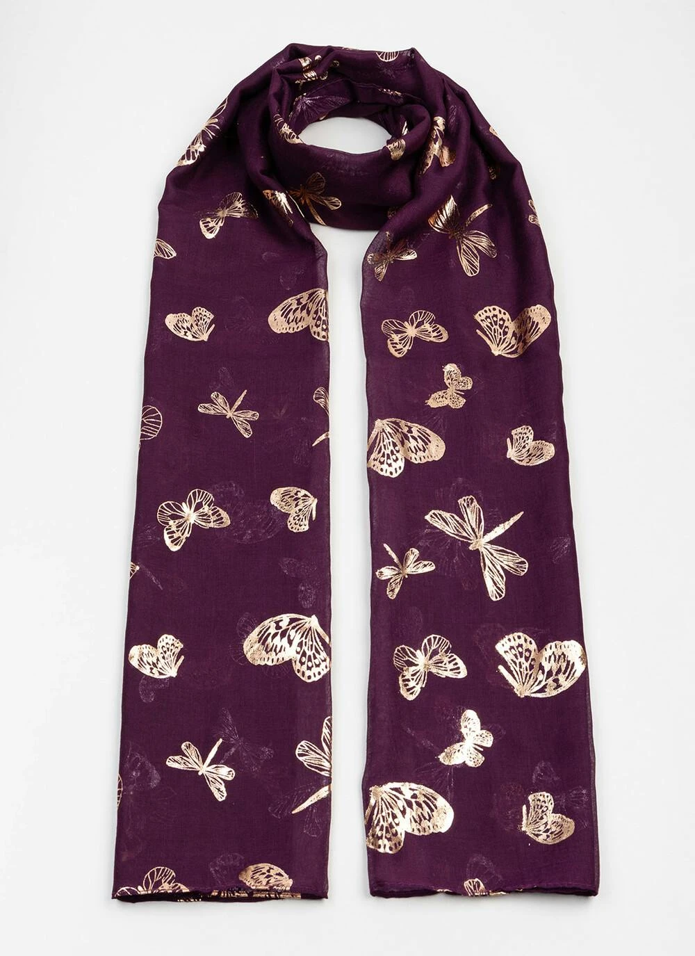 Accessorise your outfit in style with this lightweight scarf featuring a delicate shimmering foil print.