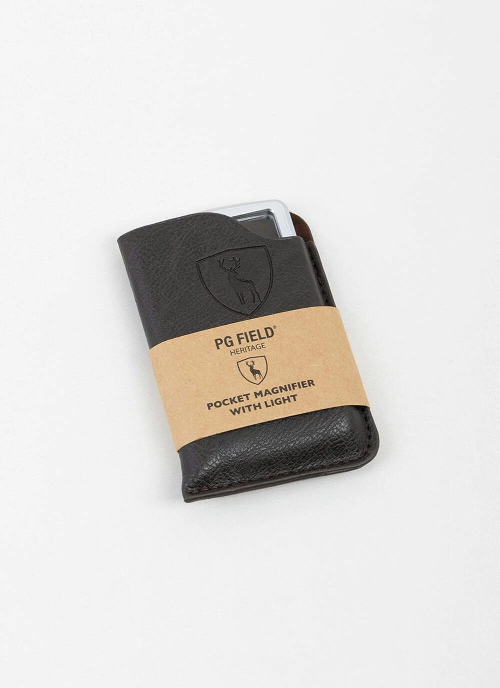 Pocket Magnifier in protective brown PU pouch with bright LED light. Perfect for reading menus and labels on-the-go.