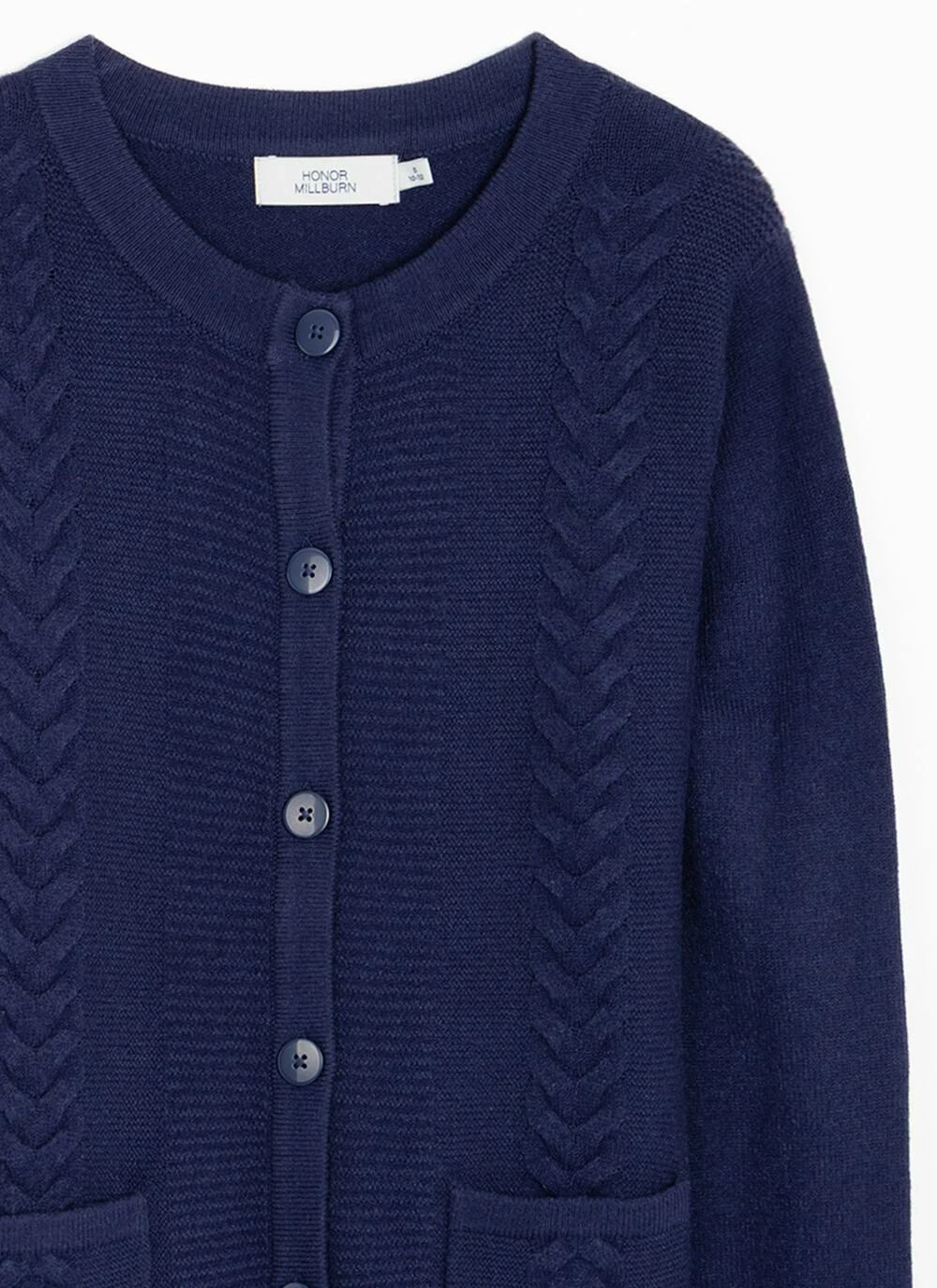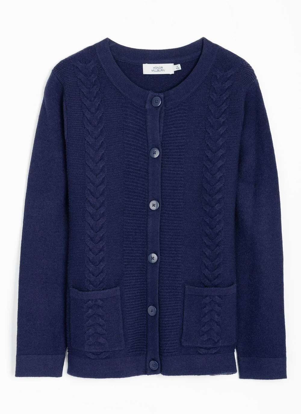 Button up round neck cardigan with long sleeves and two functioning front pockets, featuring feminine cable detailing. Team with Honor Millburn Collection trousers and skirts for a lovely fresh look for the new season.