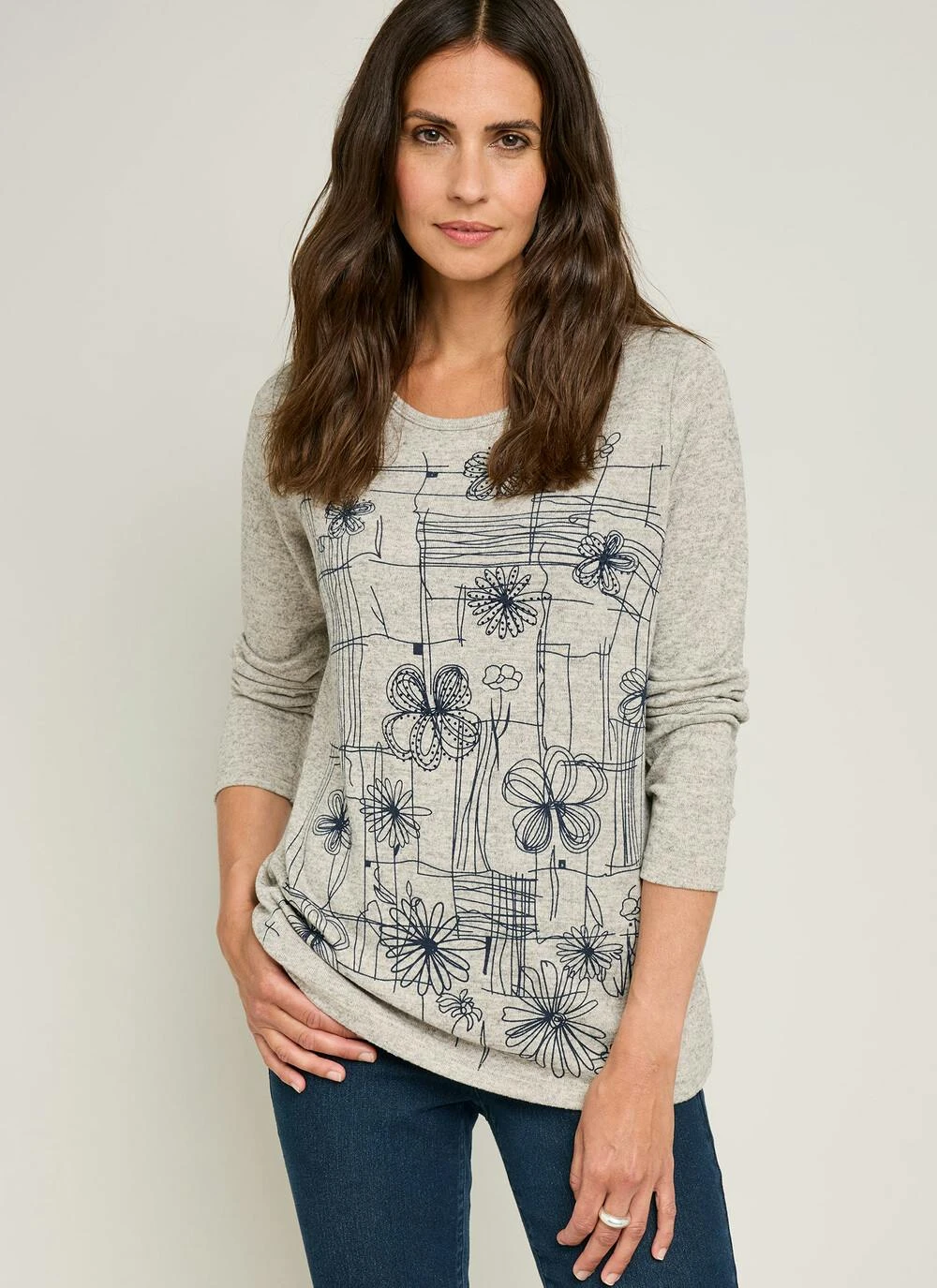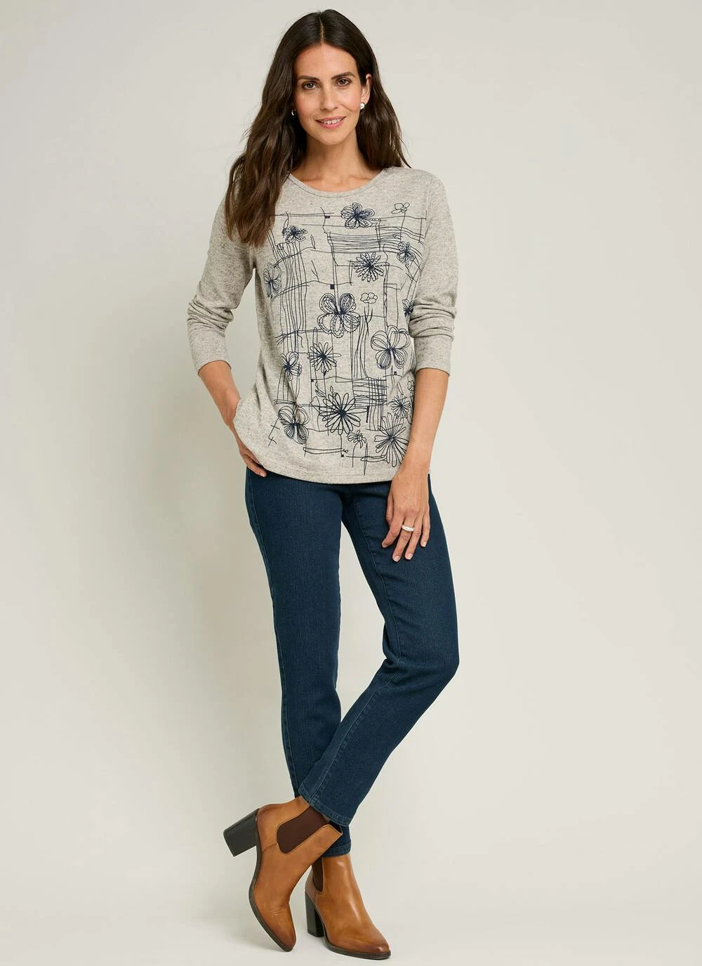 Add a subtle shimmer to your everyday style with the Soft Touch Sparkle Placement Print Top. Crafted from a luxuriously soft fabric, this top features a delicate sparkle print placed with care for a refined touch of glamour. The relaxed fit and long sleeves make it perfect for both layering and lounging, while the soft neutral tones offer easy pairing with your autumn wardrobe.