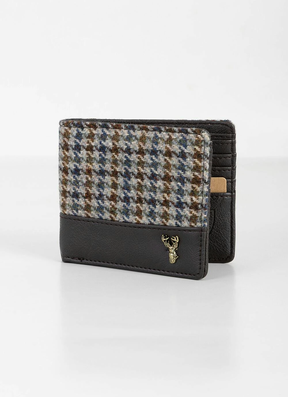 Men’s Tweed Wallet in Houndstooth check with brown PU trim. Complete in a stylish check print gift box making this a perfect gift for a loved one. Holds up to 8 cards and has 2 note sections.
